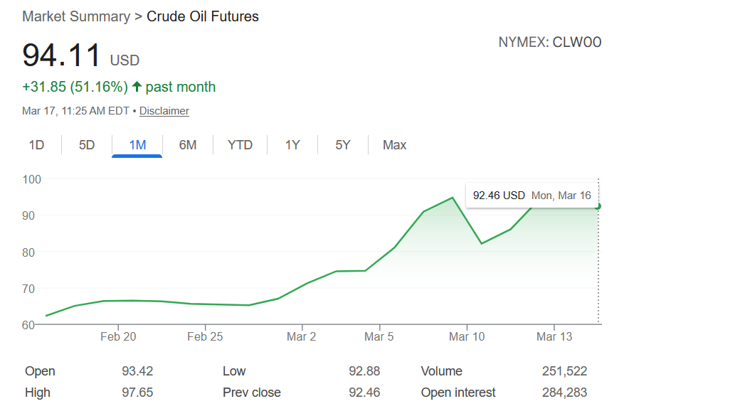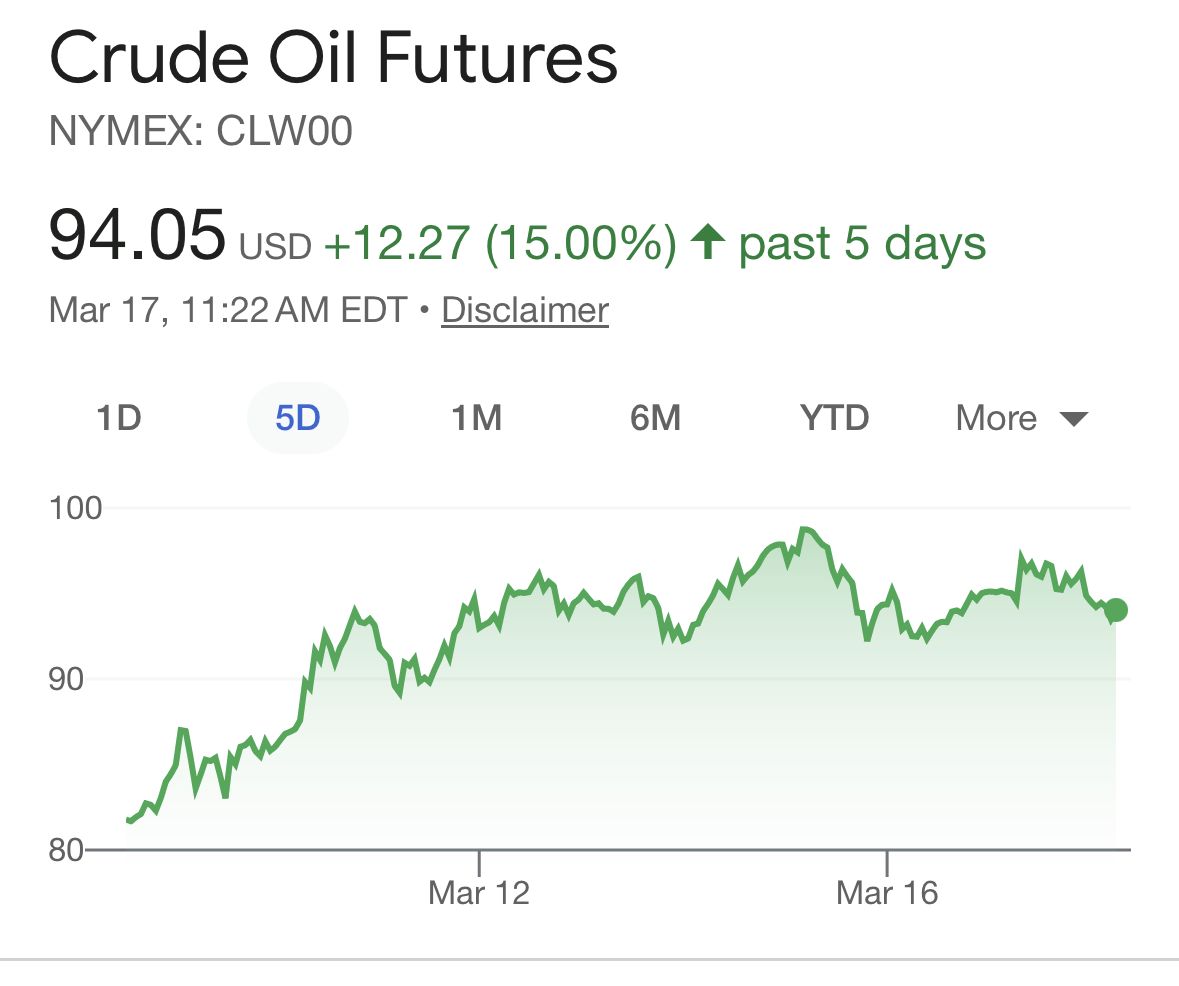 Oil is 95 only because US propaganda has people believe this will be a short war. Will be ova any day now. When that bubble burst, hang on to your hat.