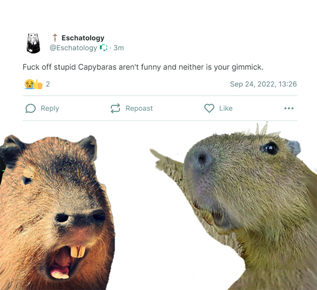 @graf @koropokkur @Morghur @Dagnar @The_Almighty_Kek @madcuzbad @Groomschild @HonkHonkBoom @King_Noticer @NoDoxGregBrady @OeakEyDoork @Twoinchdestroya @William_The_Dragonborn @putrid @suquili had to make this capy version of the soy meme for that one.